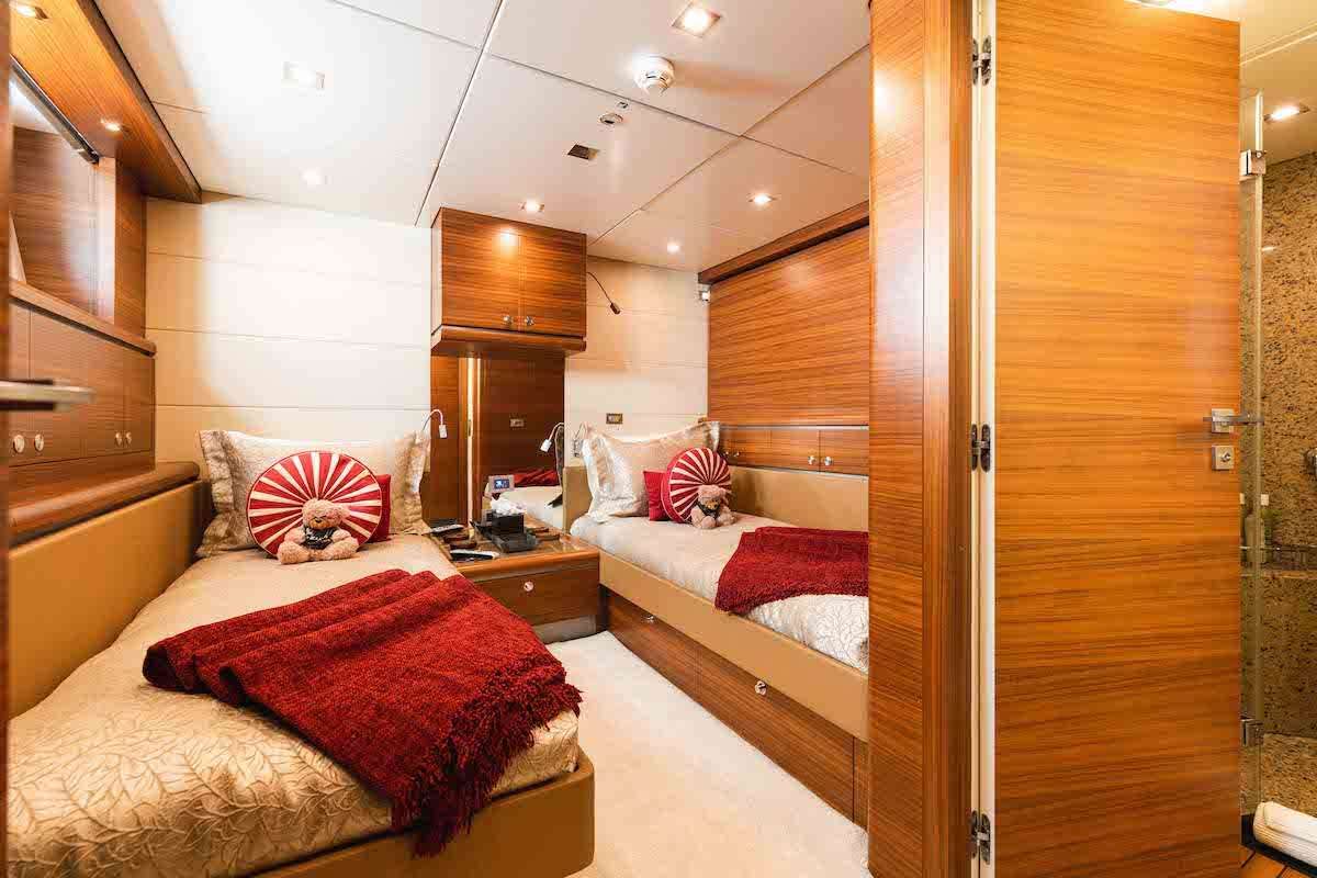 Five ensuite staterooms luxuriously accommodate up to 12 guests, featuring an ondeck Master, a lower VIP with King, an additional custom KING stateroom mid-ship and two Twin cabins with Pullman berths- one Twin cabin is aft via a separate staircase and is ideal for older kids. All staterooms are equipped with HD TV's, Apple TV, Crestron. All staterooms have been refurbished and redesigned to create unique and modern spaces with a luxurious feel. The ondeck master has a King bed at the centerline, a comfortable lounging area to port and a vanity table to starboard with plenty of storage and a full hanging closet. The master ensuite features double granite sinks, full shower, separate bathtub and a separate toilet and bidet closet.